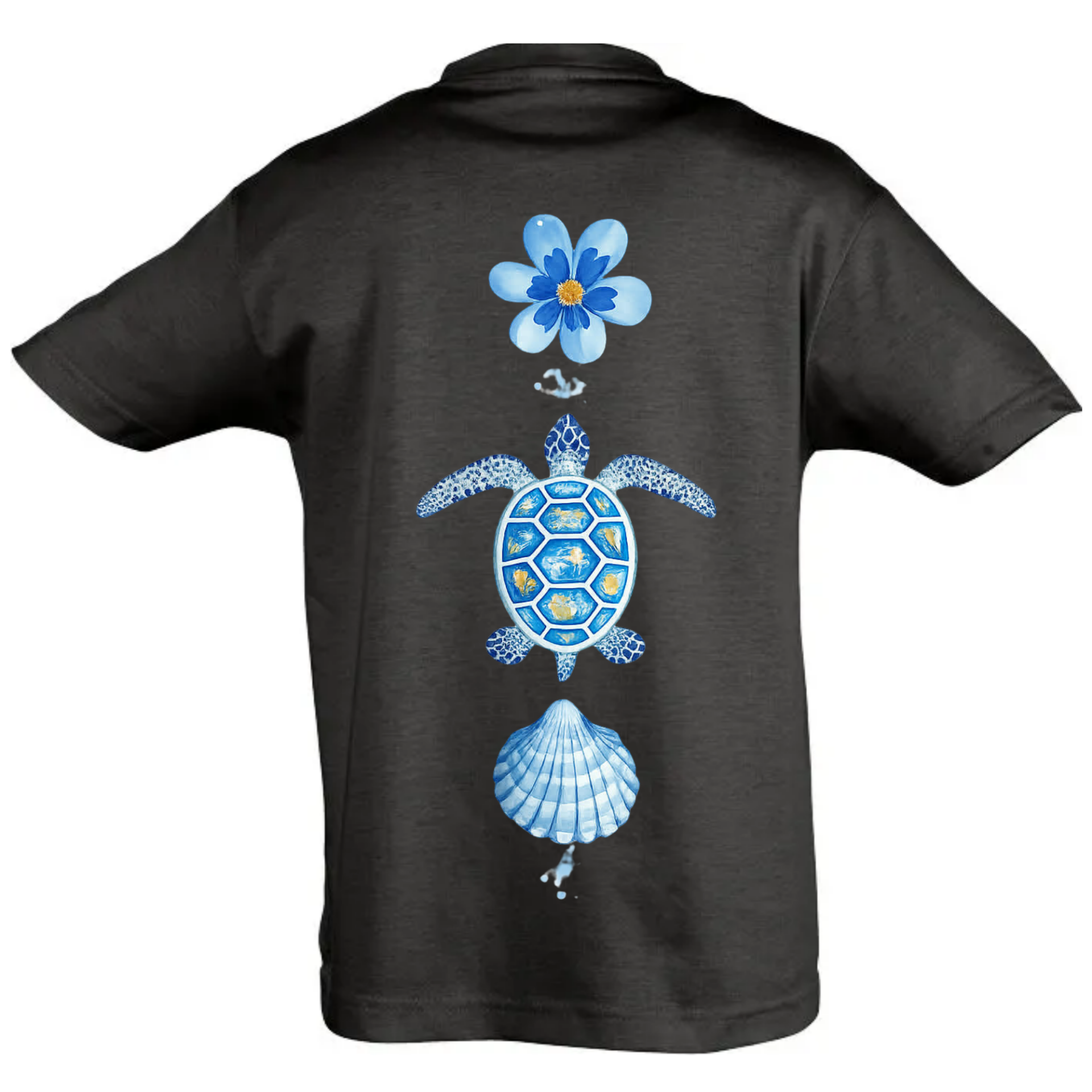 T-shirt noir élégant avec un design unique inspiré de l’océan. À l’avant, un petit logo tortue discret sur la poitrine, et au dos une grande illustration artistique avec une tortue bleue accompagnée d’une fleur et d’un coquillage. Un style original qui rappelle la mer et la nature.