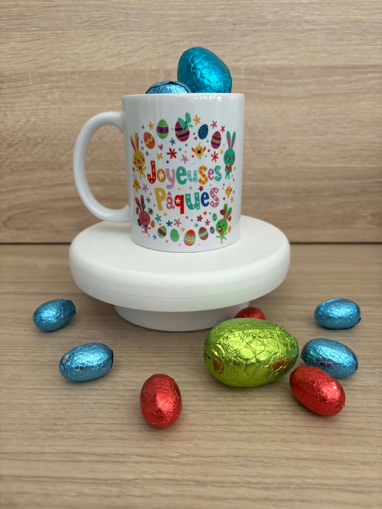 Apportez une touche de douceur et de couleurs à vos moments café avec ce magnifique mug Joyeuses Pâques remplie de chocolat.
